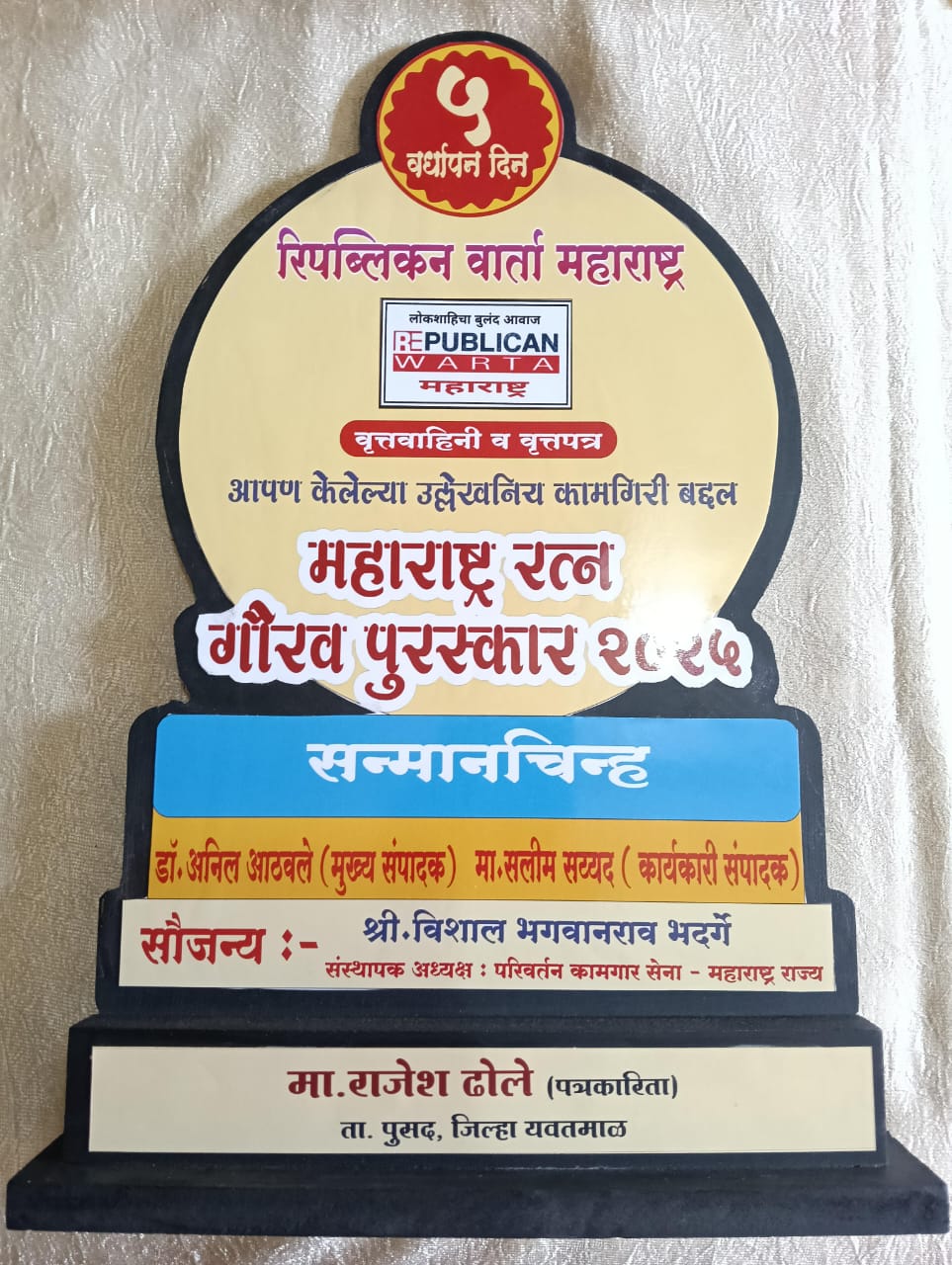 रिपब्लिकन वार्ता वृत्तपत्र व वृत्त वाहिनीच्या 5 व्या वर्धापन दिनानिमित रोटरी क्लब सभागृह गंजमाळ नाशिक येथे झालेल्या कार्यक्रमात रिपब्लिकन वार्ता वृत्तपत्र समूहाचे विदर्भ विभाग उपसंपादक राजेश ढोले यांना पत्रकार, व सामाजिक क्षेत्रातील उल्लेखनीय योगदान व महत्त्वपूर्ण कामगिरी बद्दल व राज्यस्तरीय, महाराष्ट्र रत्न गौरव पुरस्कार सन्मान चिन्ह व पुष्पगुच्छ देऊन गौरवविण्यात आले आहे. सविस्तर वृत्त असे की रिपब्लिकन वार्ता वृत्तपत्र व वृत्तवाहिनीच्या वतीने महाराष्ट्रातील विविध क्षेत्रात उल्लेखनीय काम करणाऱ्या नामवंत किर्तीवंत यांना महाराष्ट्र रत्न गौरव पुरस्कार सोहळ्याचे मुख्य आयोजन दिनांक 15 ऑक्टोबर 2025 रोजी रोटरी क्लब सभागृह गंजमाळ नाशिक येथे मुख्य सोहळ्याचे करण्यात आले